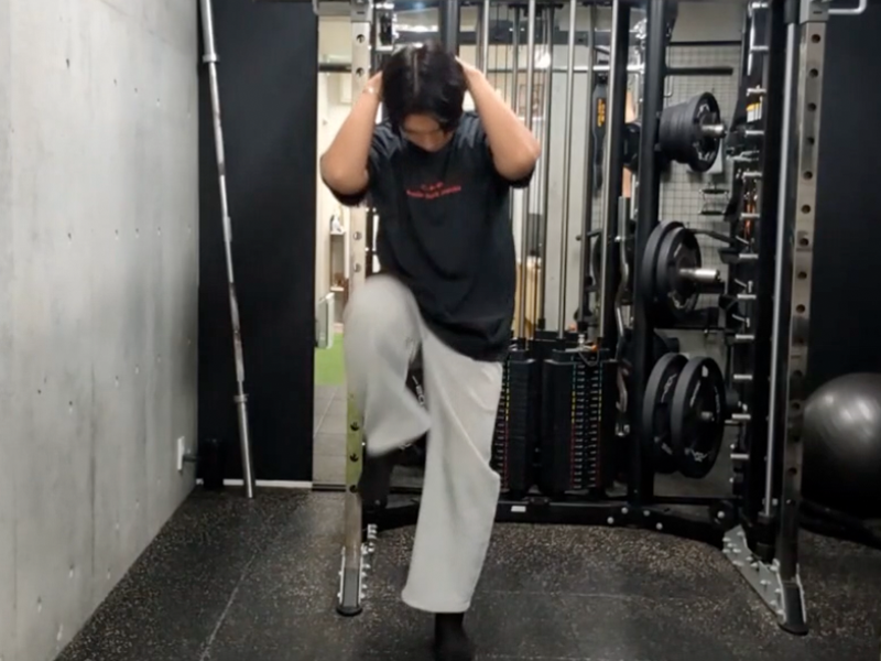 手を後ろで組んで、横っ腹を潰すように膝と肘をしっかりと動かしましょう。